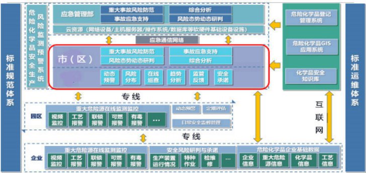 根據應急管理部相關建設指南要求,危險化學品安全生產風險監測預警系統利用數據采集設備,依托專線接入企業重大危險源的實時監測數據和視頻監控數據等,總體架構設計包括應急管理部、市(區)應急管理部門、化工園區(以下簡稱園區)、企業四級,系統建成后分別集成至上海市應急管理綜應用平臺和部級應急管理大數據應用平臺。危險化學品安全生產風險監測預警系統總體架構如圖 1 所示。